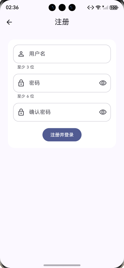 注册:输入用户名/密码,创建本地用户,并自动登录。