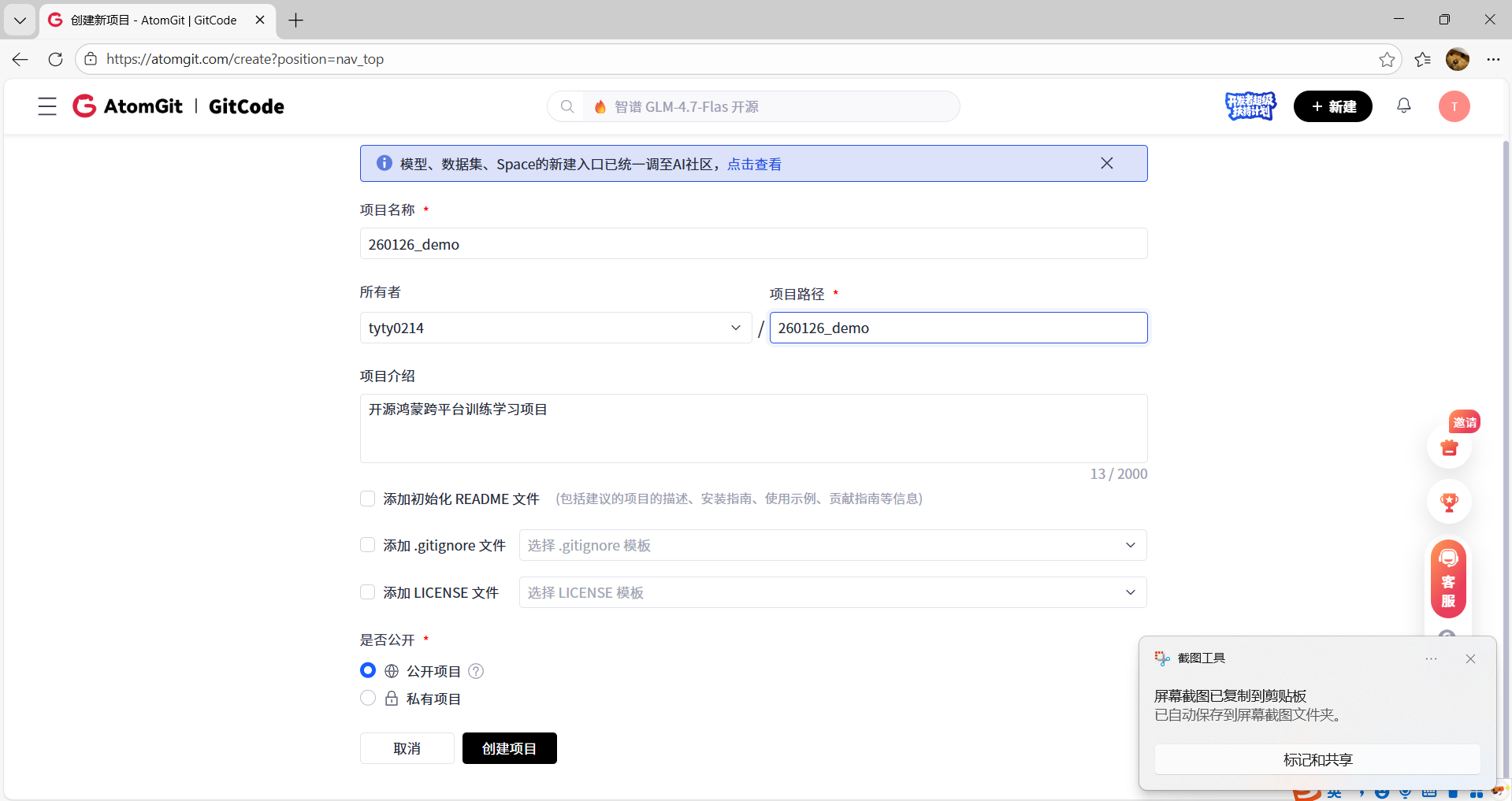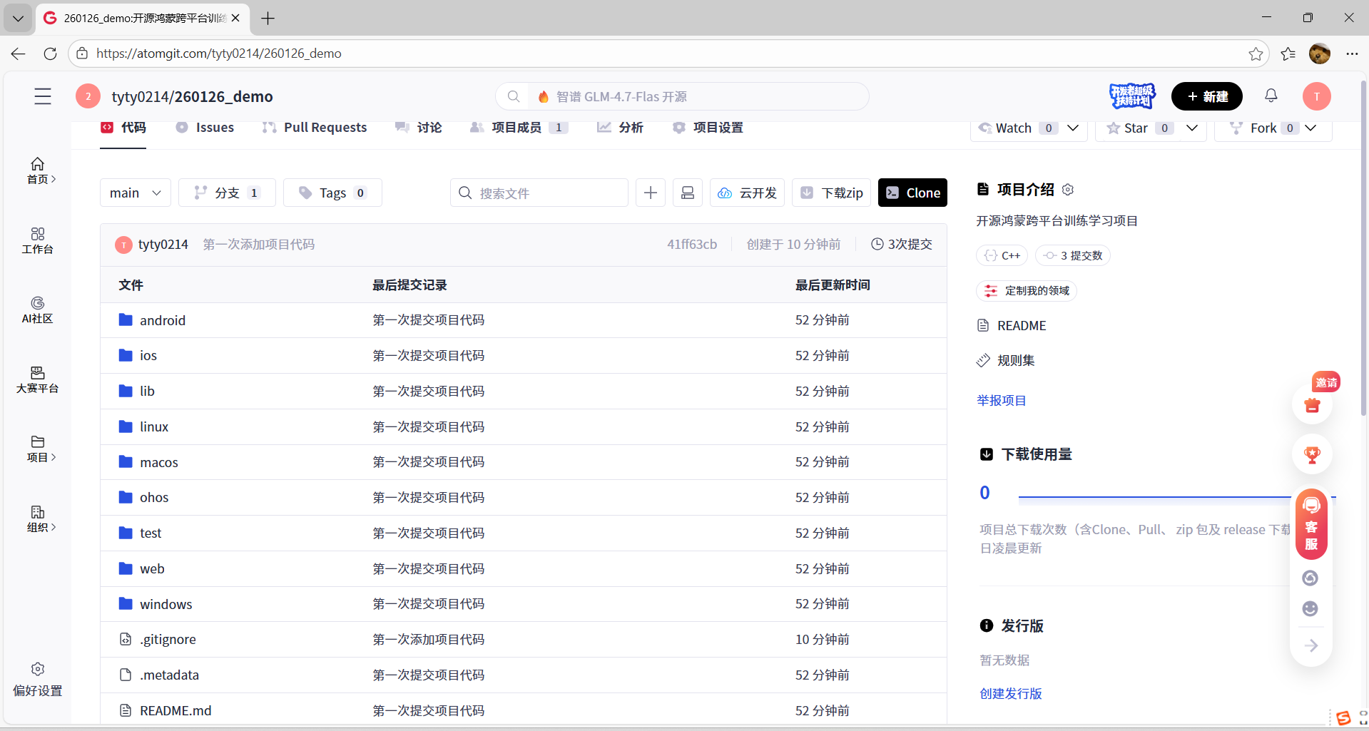 项目代码推送成功后,回到AtomGit平台,可以看到相关记录。