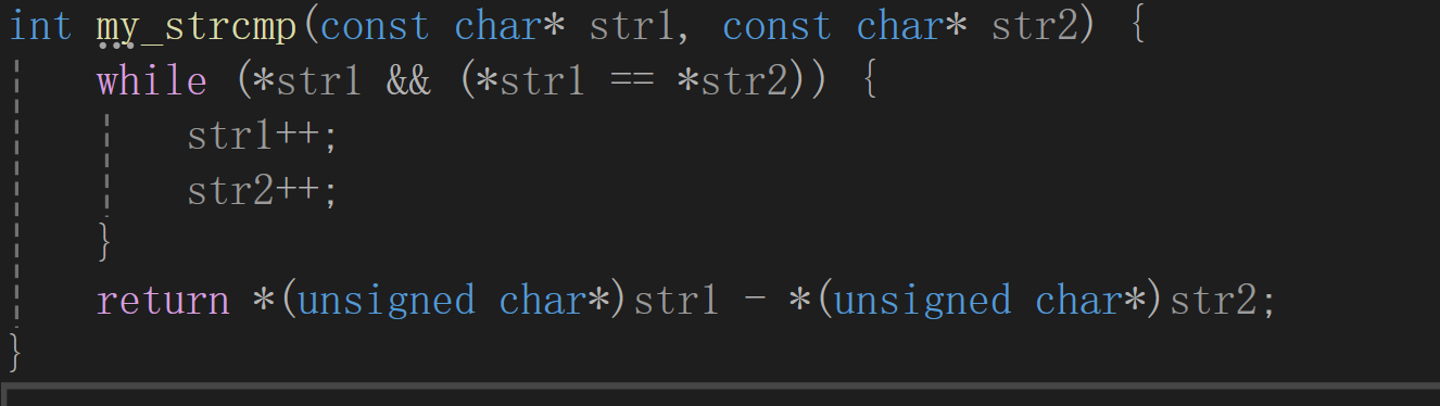 \0结尾,可能导致越界访问。 - 性能:时间复杂度为 O(n),需遍历字符串直到发现差异或结束符。
