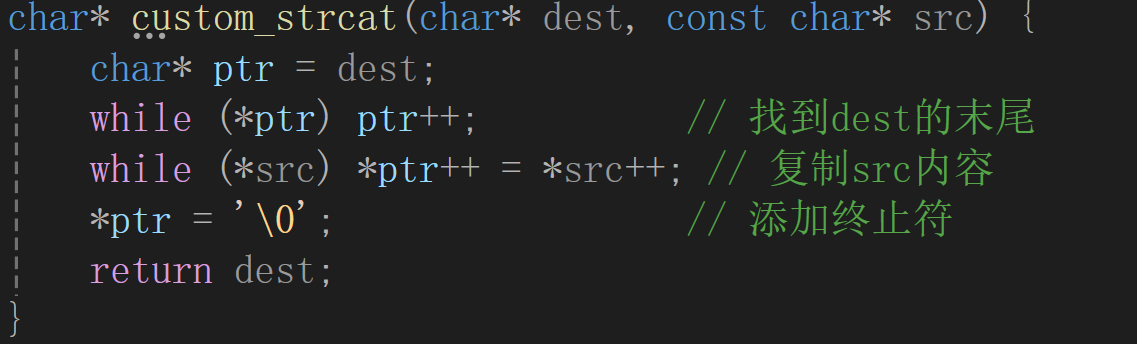 src的第一个字符开始,逐个复制到dest的末尾(覆盖dest原有的终止符)。 - 若