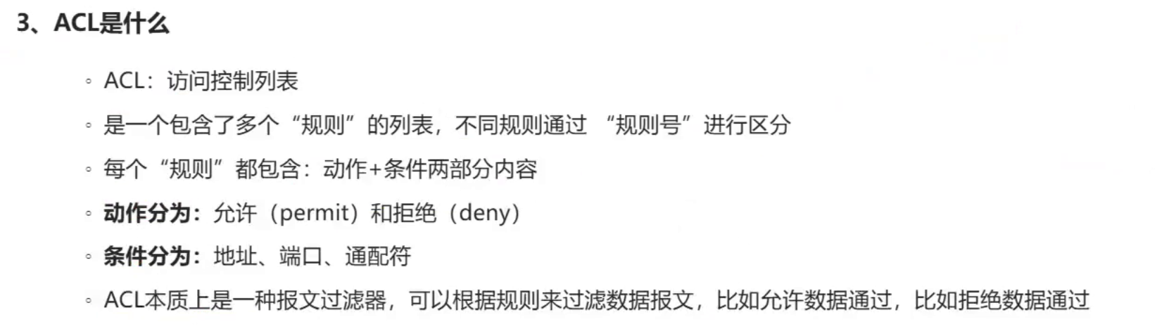 | 匹配条件 | 源IP地址、时间段 | 源IP、目的IP、协议类型(IP/TCP/UDP/ICMP等)、源端口、目的端口、优先级、时间段等 |
