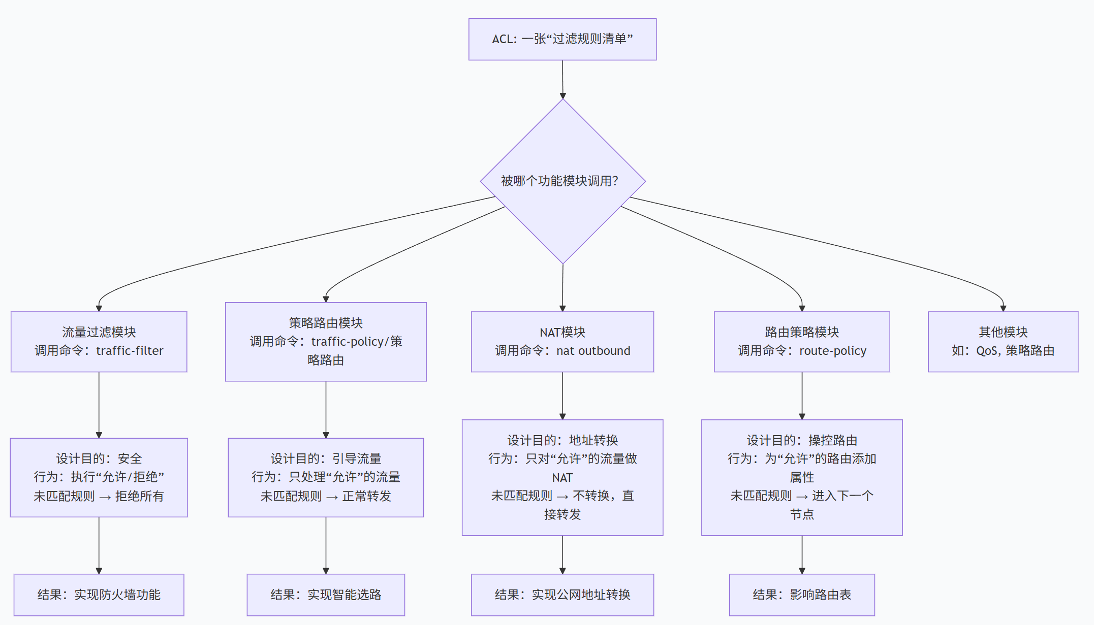 关键:这份“过滤清单”可以被网络设备里不同的功能模块拿去使用。不同的模块,对清单里“允许/拒绝”的理解完全不同! 这就是你所有困惑的根源。