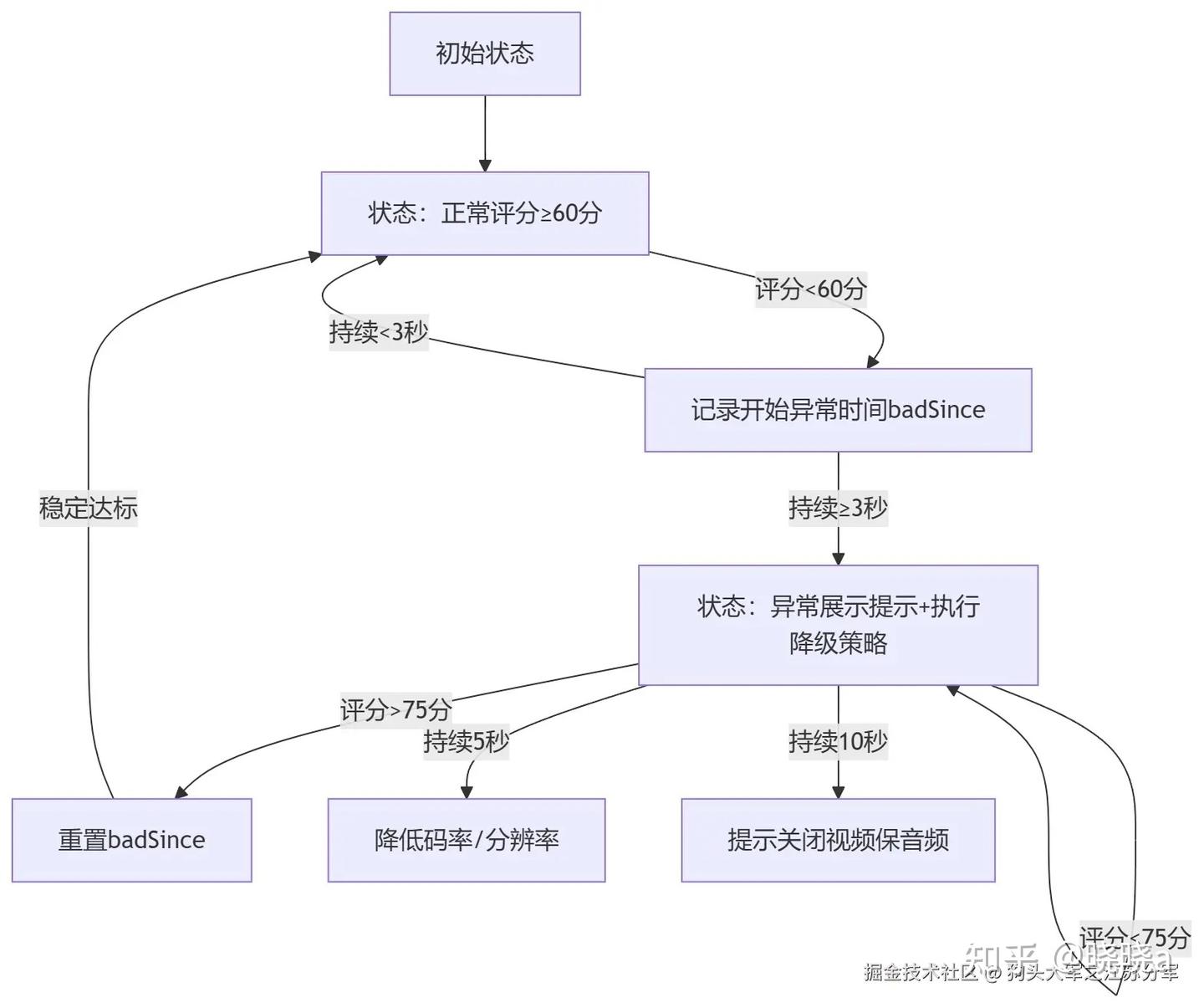 进入阈值:评分连续低于 X,持续 ≥ T 秒 退出阈值:评分连续高于 Y(Y > X),持续 ≥ T′ 秒 状态锁定:同一状态不重复触发提示
