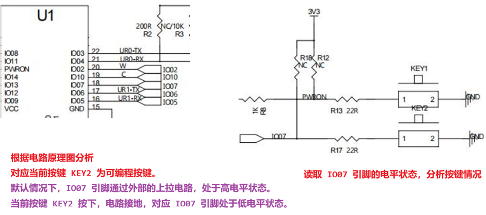根据电路分析,当前按键对应引脚 IO07 默认情况下是高电平状态