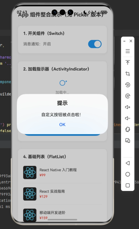 为了学习rn的其他组件,我们先编写一个简单的组件使用代码。这段代码是一个RN 基础组件整合演示页面,没有复杂业务逻辑,核心目的是展示 RN 中常用的 UI 组件和基础语法,包含开关、加载指示器、自定义按钮、列表、输入框等功能,并且做了基础的样式美化和适配。
