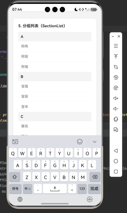 data+renderItem+keyExtractor,用于展示普通列表数据。 - SectionList:分组高性能列表,核心属性