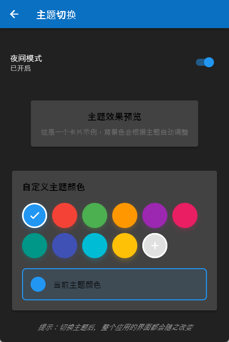 在实际开发中,开发者可以根据应用的具体需求和复杂度,灵活调整本文介绍的方案。无论是小型应用还是大型项目,一个良好的主题管理系统都能为用户提供更加个性化、舒适的使用体验。