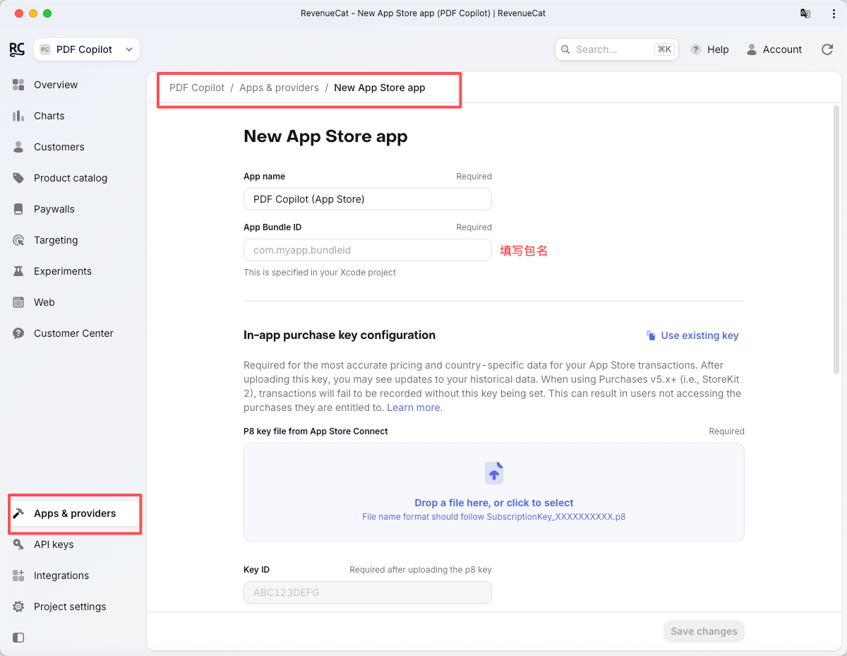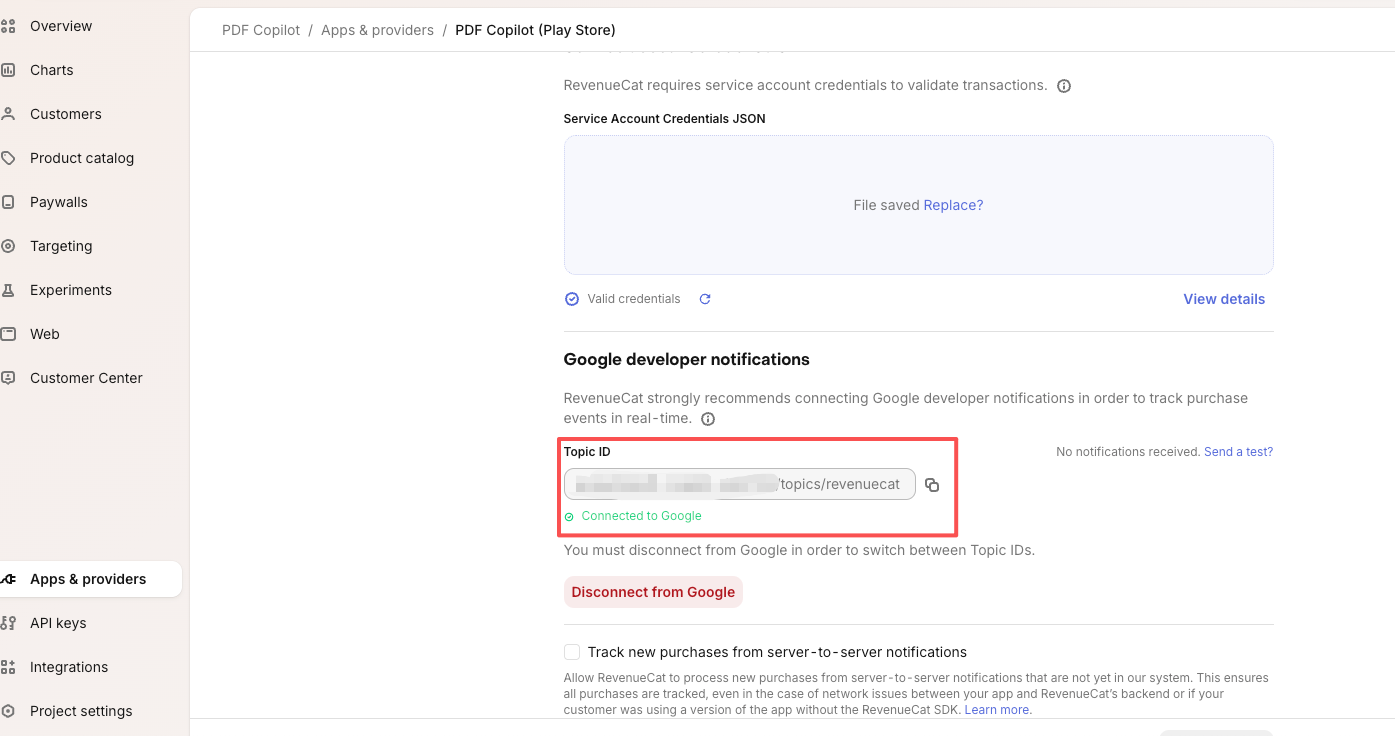 操作路径:RevenueCat 后台 -> Project Settings -> Apps & providers -> Play Store。