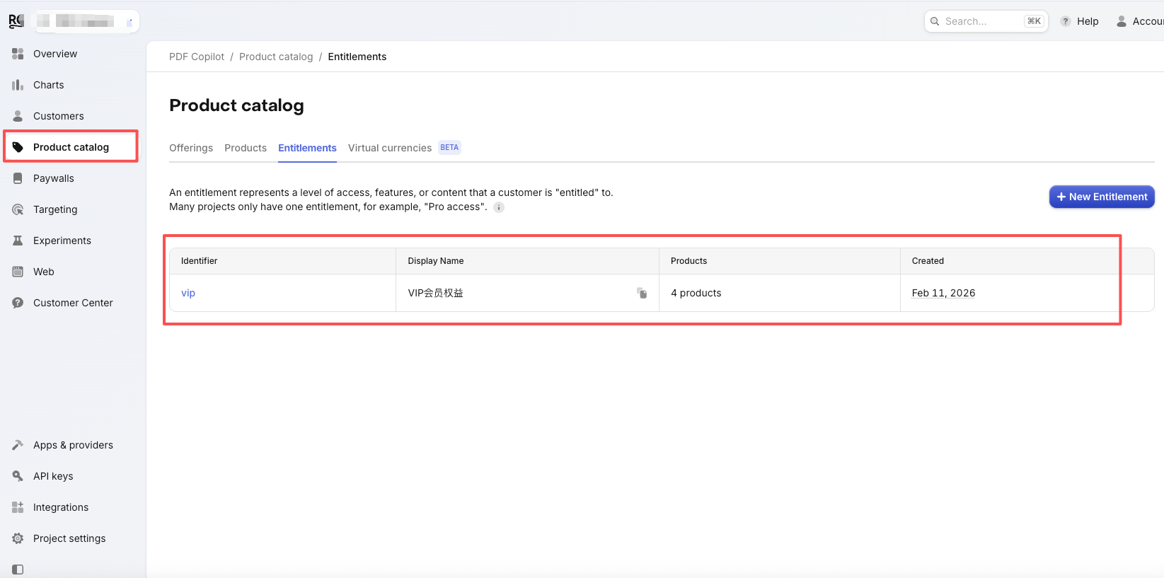 点击左侧菜单的 Entitlements (在 Product Catalog 下面或者里面找)。