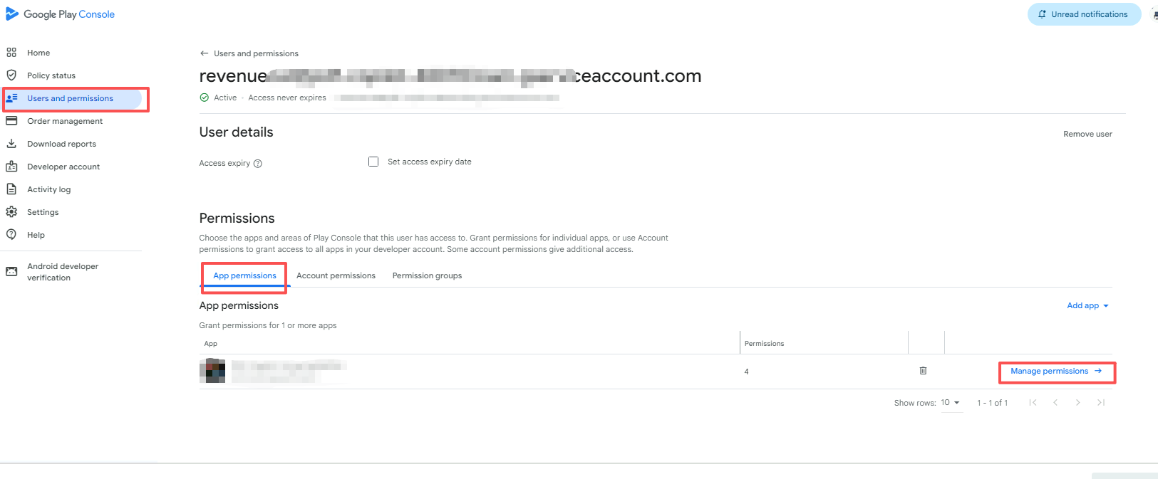 操作路径:Google Play Console -> Users and permissions -> 点击你邀请的那个服务账号 -> Account permissions 标签页。