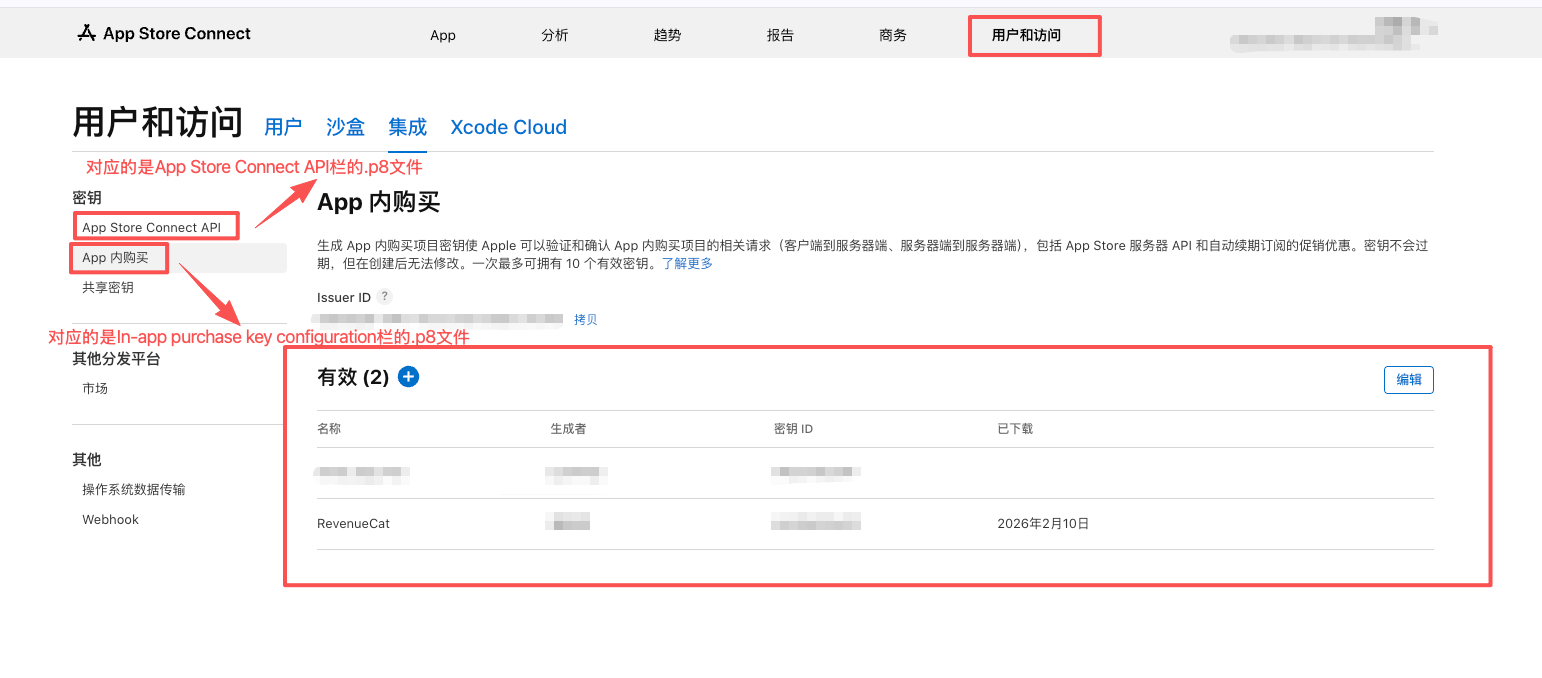 Issuer ID: 回到 App Store Connect 的同一个页面,在标题的上方(通常在“App 内购买项目”几个字的旁边或下方),有一行长长的 UUID 字符串,写着 “Issuer ID”。复制这串字符填入。