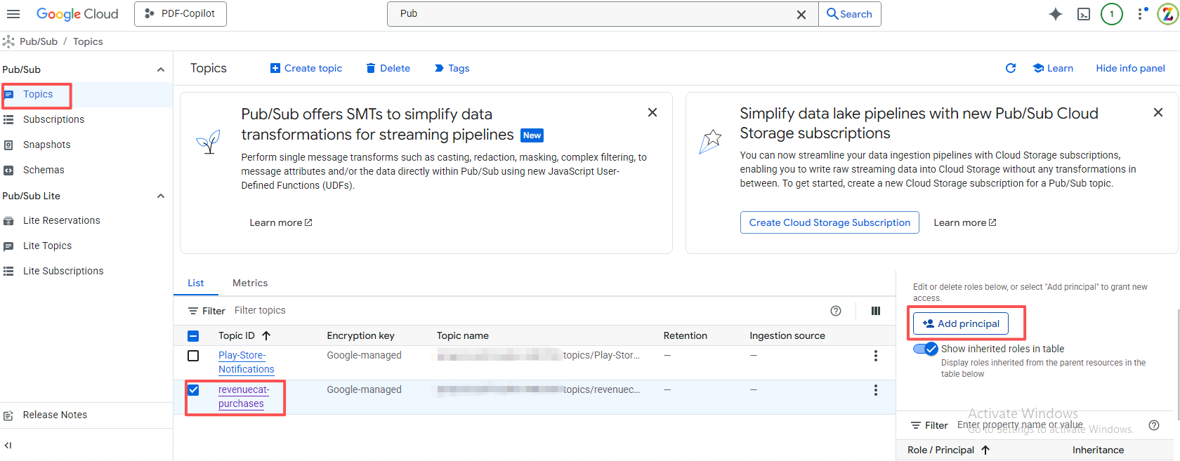 操作路径:Google Cloud Console -> Pub/Sub -> Topics -> 点击你的 Topic 进入详情 -> Permissions 面板。