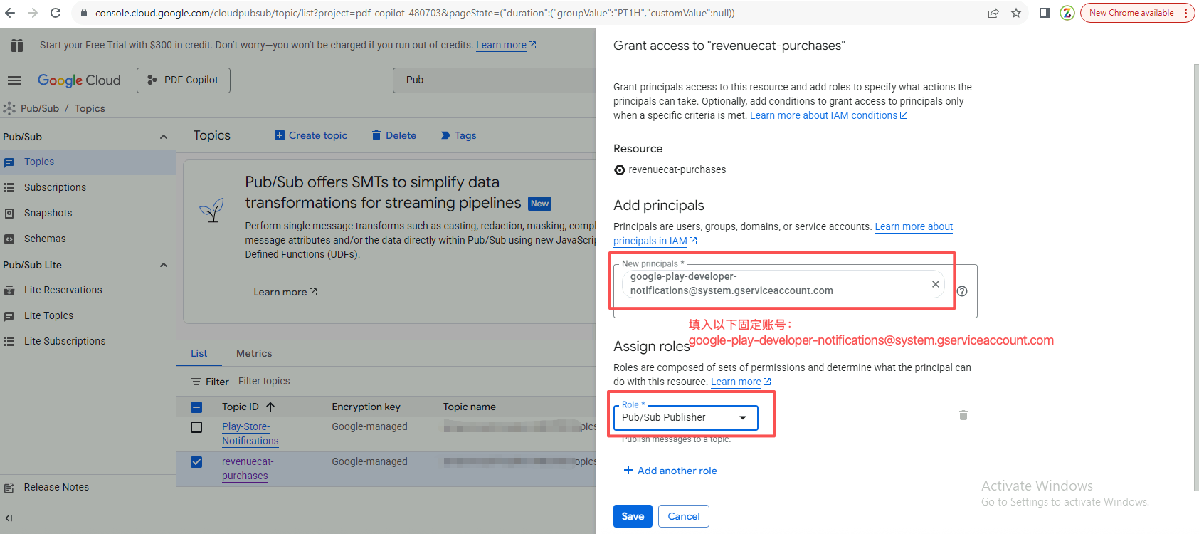 重点! 很多人这里习惯性填成了自己的服务账号,错! 必须填谷歌官方的这个发信机器人邮箱,赋予它 Pub/Sub Publisher 角色。不填这个,RevenueCat 永远收不到消息。