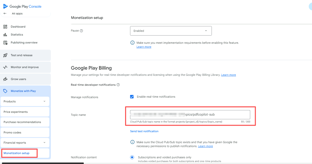 操作路径:Google Play Console -> Monetization setup -> Real-time developer notifications。