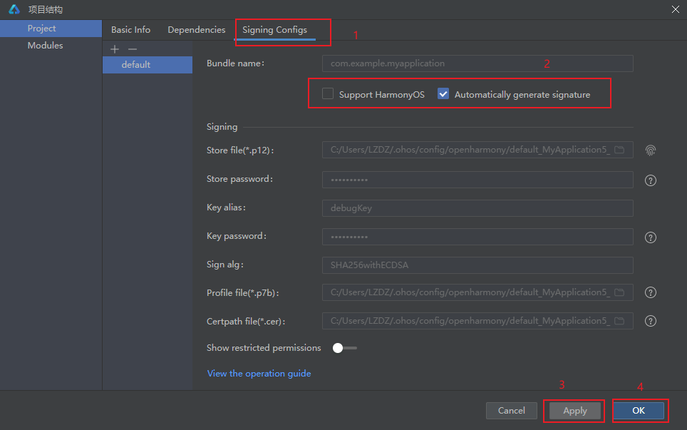 项目中的签名配置位于 build-profile.json5 文件中,示例如下: