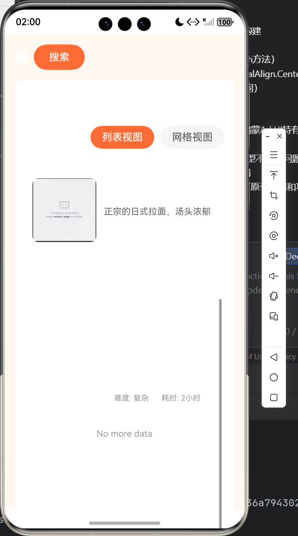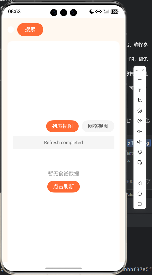 - 网络错误时显示 “加载失败,点击重试”,支持点击重新请求数据,空数据时显示 “暂无食谱数据”。