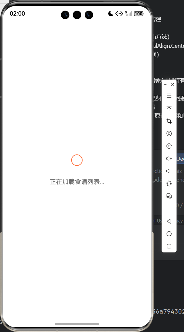 - 页面中央显示圆形进度条 + “正在加载食谱列表...”,适配鸿蒙屏幕。