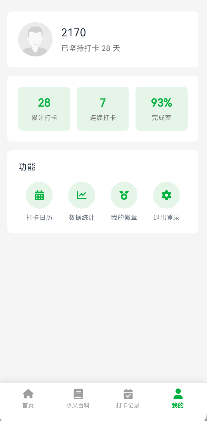 提供打卡日历、数据统计、我的徽章和退出登录等功能入口,目前只有实现退出登录