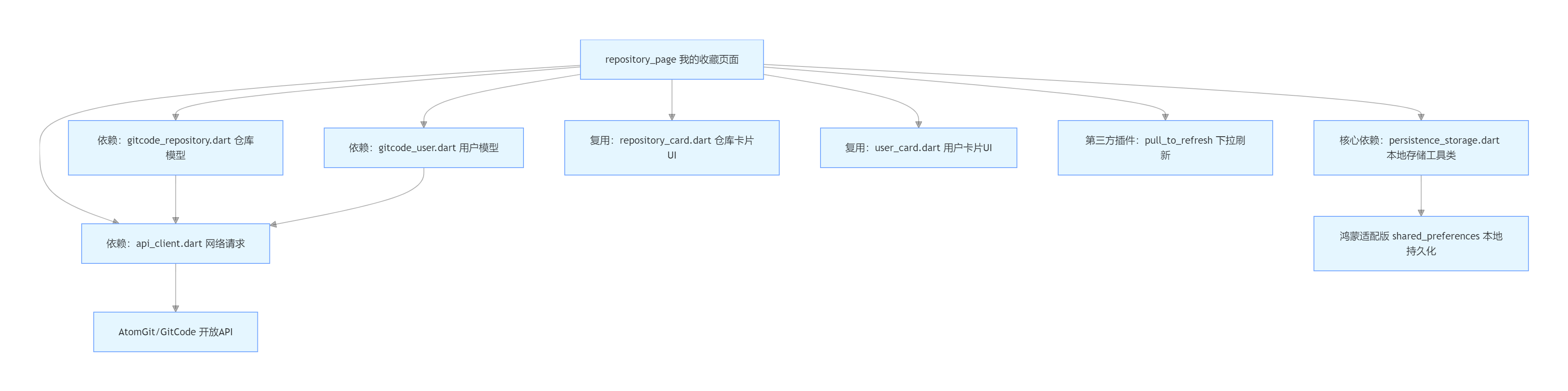 本页面文件:repository_page.dart,页面标题「我的收藏」。由上一篇拓展而来,承载两大核心功能:✅ 收藏仓库管理:展示本地收藏的所有 AtomGit/GitCode 仓库列表、支持下拉刷新、左滑取消收藏、二次确认删除✅ 关注用户管理:展示本地关注的所有用户列表、支持下拉刷新、左滑取消关注、二次确认删除