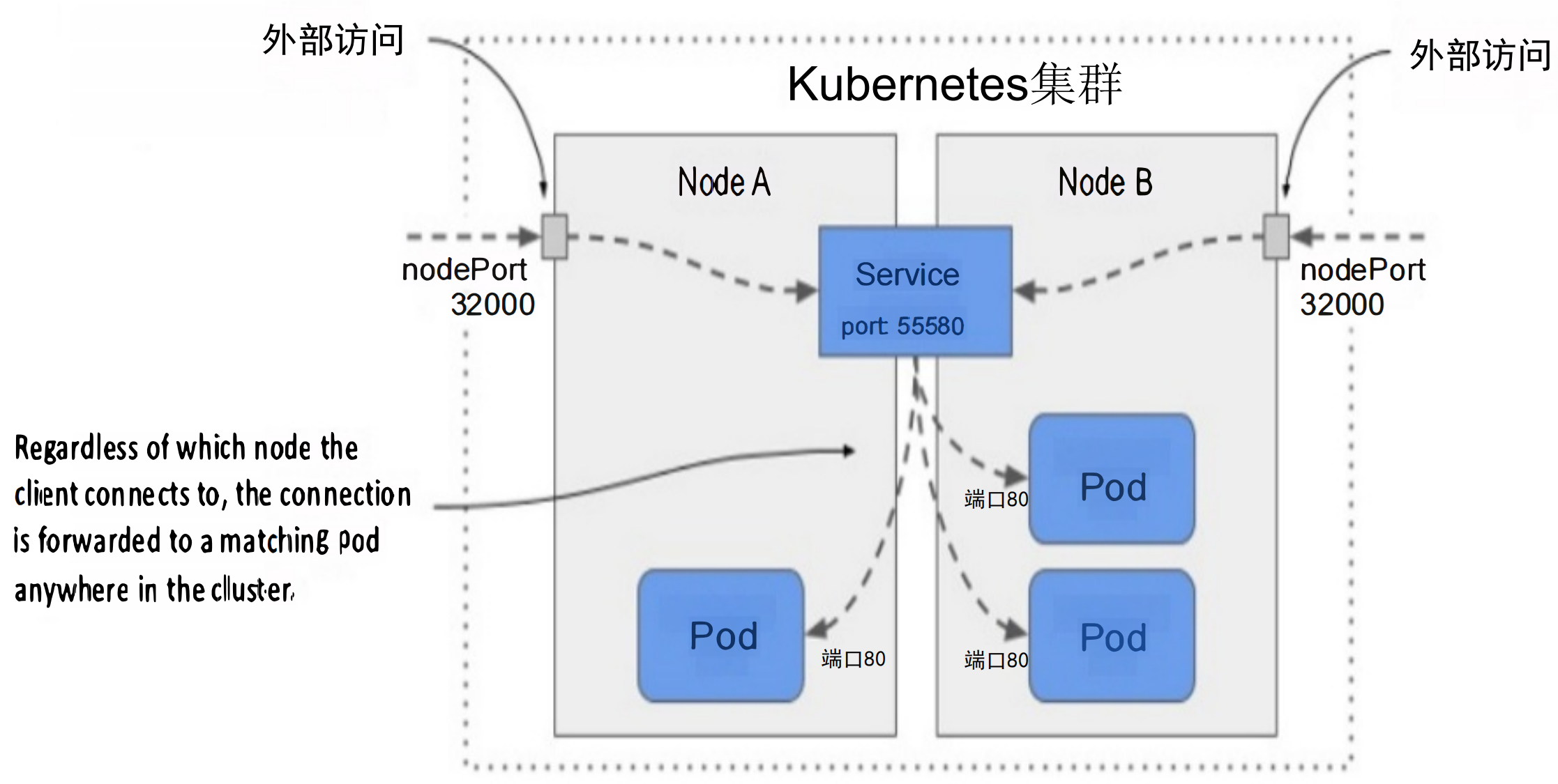 在上文type=ClusterIP的例子中,因为仅在服务虚拟VIP(clusterIP)上监听,所以只能在Kubernetes集群内(包括集群节点机器及容器内)才能访问到该Service。 在《Kubernetes in Action》书中对type=NodePort对外暴露示意图如下: