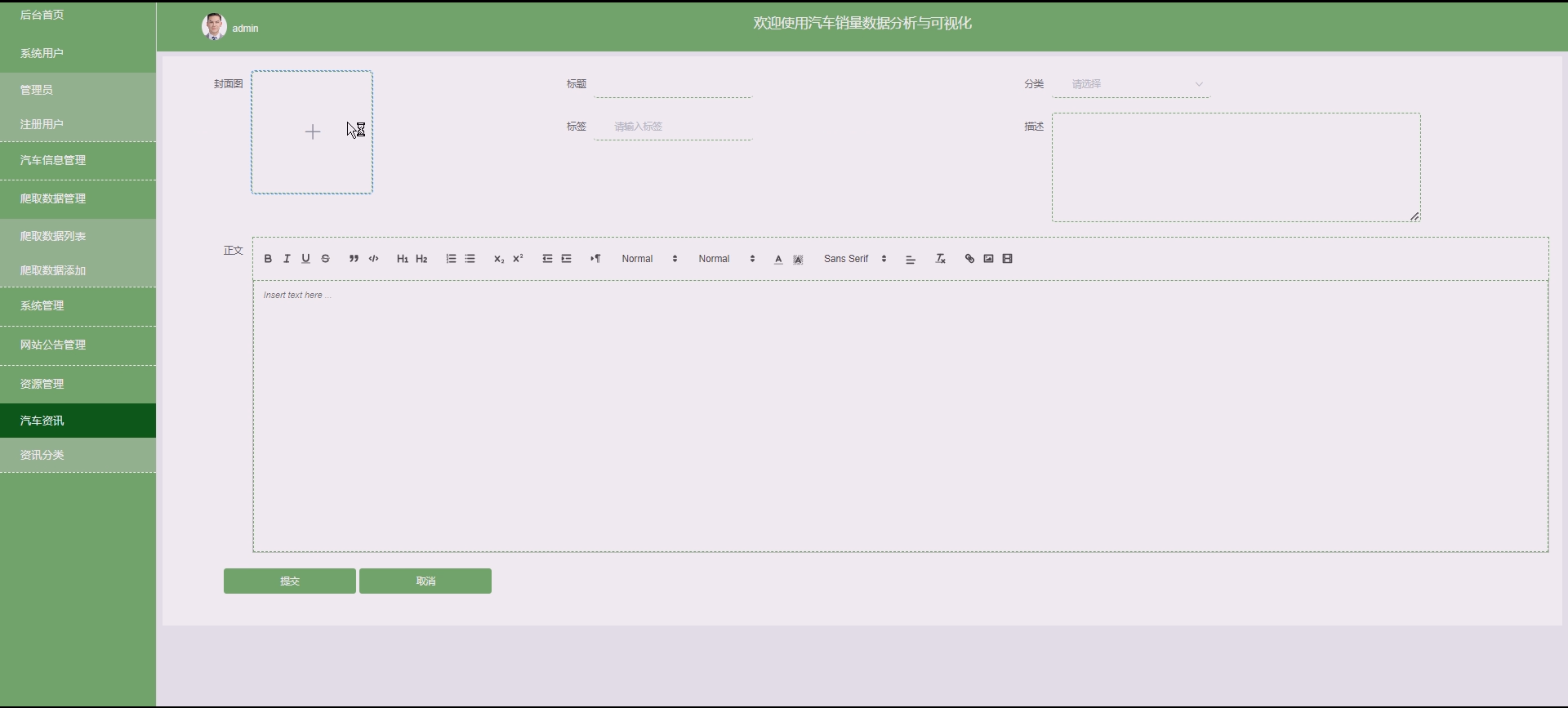 管理员在汽车资讯管理页面添加新的汽车资讯。 |