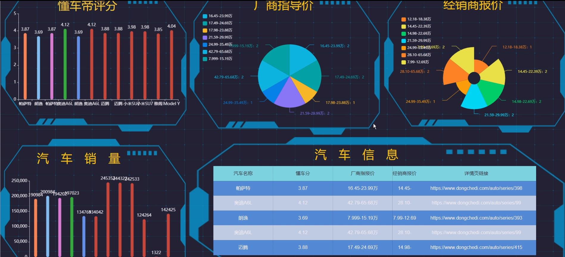 系统提供了可视化图表展示汽车信息的功能。用户可以在大屏展示页面看到懂车帝评分、厂商指导价、经销商报价、汽车销量等数据的直观图表展示。可视化大屏界面如图5-4所示。