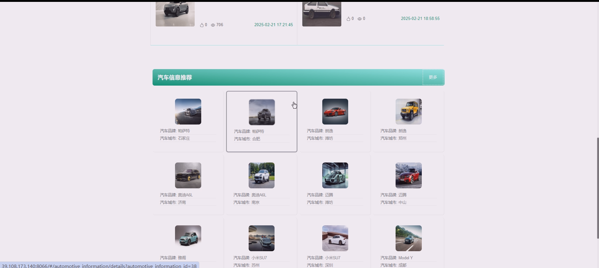 用户登录系统后,在首页可看到个性化的汽车推荐列表。系统根据用户的浏览历史、购买行为及偏好,利用智能算法推送符合用户需求的汽车信息。汽车推荐界面如图5-1所示。