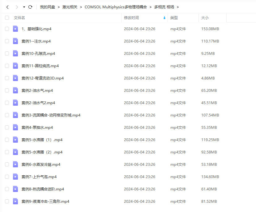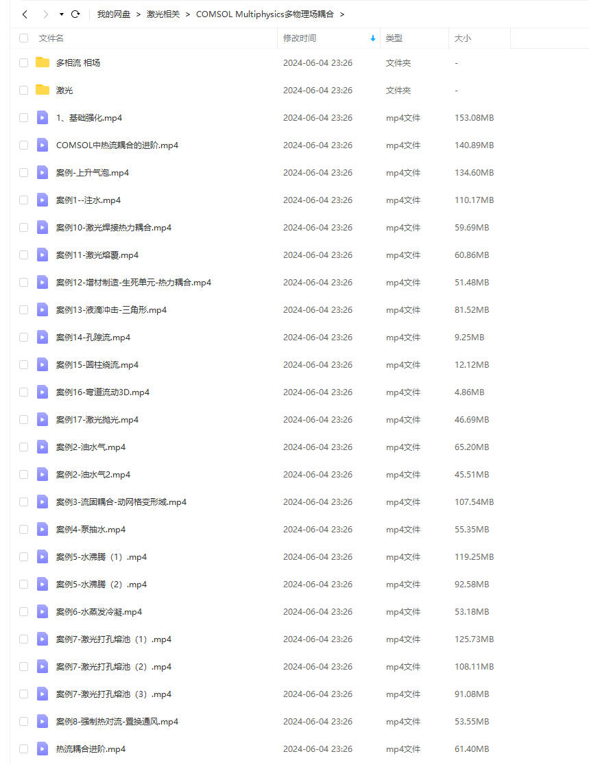 激关相关的模型,视频 增材制造.mph 激光焊接.mph run- 激光熔覆-可行.mph 激光烧蚀.mph 激光熔铸.mph 激光打孔·飞溅-较好-原始.mph 激光打孔.mph 激光打孔·飞溅-较好-原始.mph 案例7-激光打孔榕池(2).mp4 案例7-激光打孔熔池(3).mp4 案例7-激光打孔榕池(1).mp4 激光打孔.mph COMSOL Multiphysics多物理场耦合 1、基础强化.mp4 COMSOL中热流耦合的进阶.mp4 案例-上升气泡.mp4 案例1-注水.mp4 案例10-激光焊接热力耦合.mp4 案例11-激光熔覆.mp4 案例12-增材制造-生死单元热力耦合.mp4 案例13-液滴冲击-三角形.mp4 案例14-孔障流.mp4 案例15-圆柱绕流.mp4 案例16-弯道流动3D.mp4 案例17-激光抛光.mp4 案例2-油水气.mp4 案例2-油水气2.mp4 案例3-流固耦合-动网格变形域.mp4 案例4-泵抽水.mp4 案例5-水沸腾(1).mp4 案例5-水沸腾(2).mp4 案例6-水蒸发冷凝.mp4 案例7-激光打孔熔池(1).mp4 案例7-激光打孔榕池(2).mp4 案例7-激光打孔榕池(3).mp4 案例8-强制热对流-置换通风.mp4 热流耦合进阶.mp4 增材制造-生死单元-热力耦合.mp4 水沸腾.mp4 水沸腾2.mp4 激光打孔增池1.mp4 激光打孔榕池2.mp4 激光打孔培池3.mp4 激光抛光.mp4 激光焊接耦合.mp4 激光覆.mp4 1、基础强化.mp4 案例1--注水.mp4 案例10-孔隙流.mp4 案例11-圆柱绕流.mp4 案例12-弯道流动3D.mp4 案例2-油水气.mp4 案例2-油水气2.mp4 案例3-流固耦合-动网格变形域.mp4 案例4-泵抽水.mp4 案例5-水沸腾(1).mp4 案例5-水沸腾(2).mp4 案例6-水蒸发冷凝.mp4 案例7-上升气泡.mp4 案例8-热流耦合进阶.mp4 案例9-液滴冲击-三角形.mp4