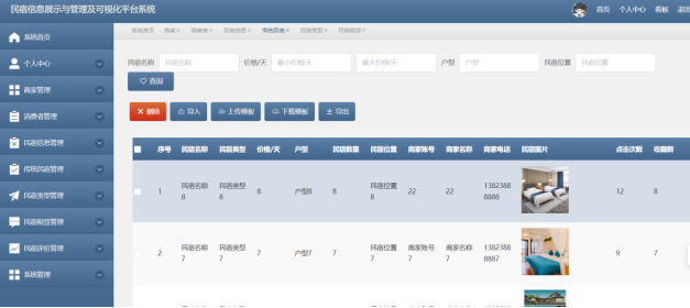 管理员点击传统民宿管理,在传统民宿管理页面输入民宿名称、价格、户型、民宿位置,可以查询或删除传统民宿,并根据需要对传统民宿进行相对应的操作。如图5-13所示: