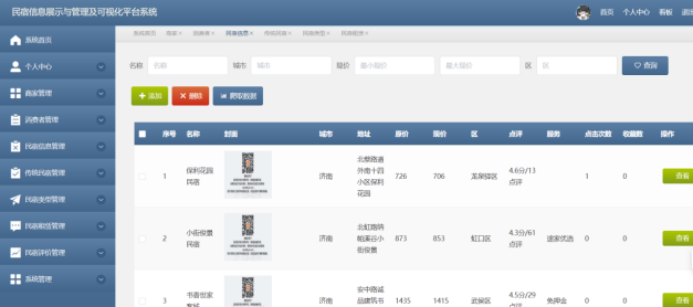 管理员点击民宿信息管理,在民宿信息管理页面输入名称、城市、现价、区,可以查询,添加、删除或者爬取数据,并根据需要对民宿信息进行相对应的操作。如图5-12所示:
