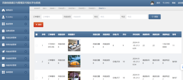 管理员点击民宿评价管理,在民宿评价管理页面输入订单编号、民宿类型、姓名、电话,可以查询或删除民宿评价,并根据需要对民宿评价进行相对应的操作。如图5-15所示: