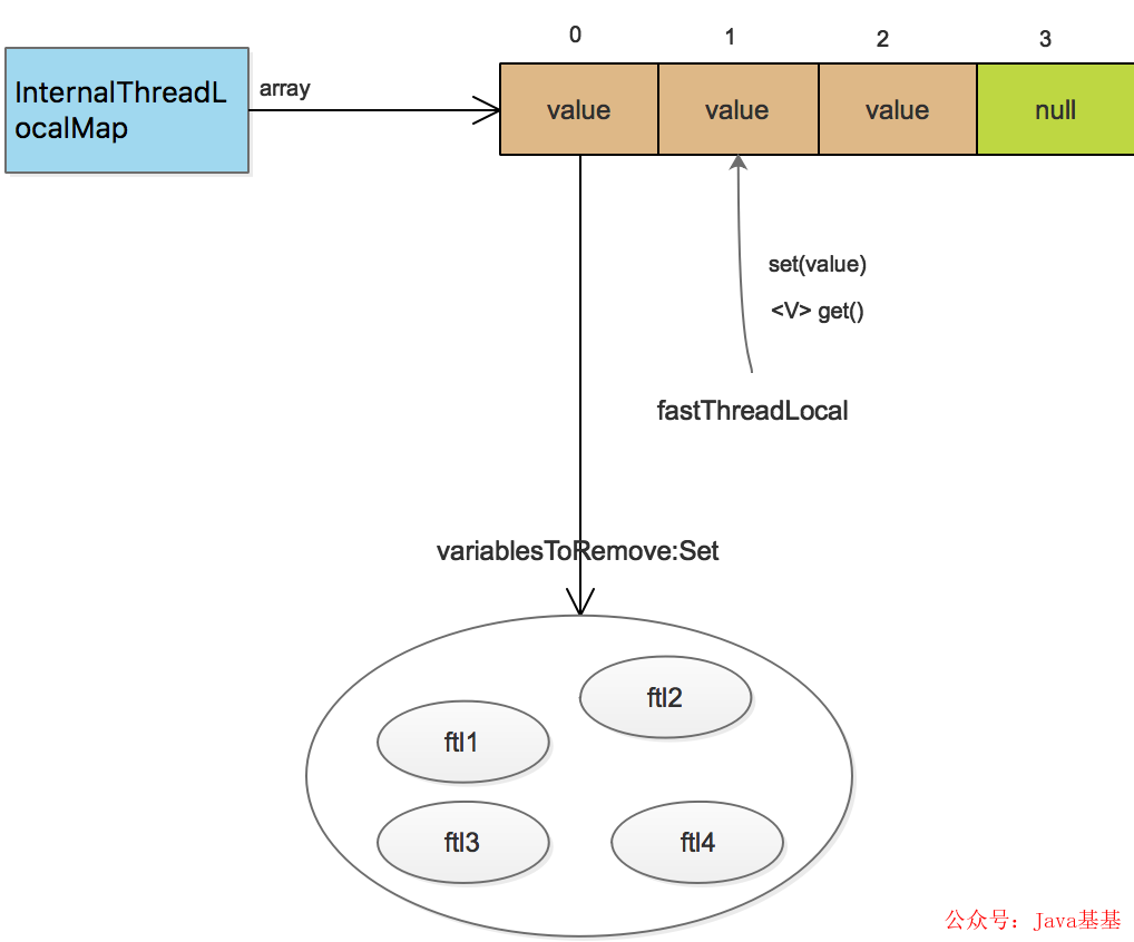 注意,这里保存的直接是变量值,不是entry,这是和jdk ThreadLocal不同的。InternalThreadLocalMap就先分析到这,其他方法在后面分析ftl再具体说。