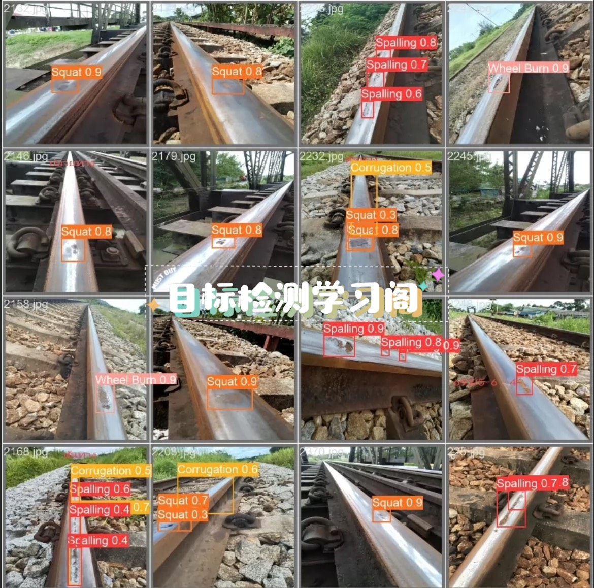 - 磨耗(Corrugation):磨耗是指轨道表面因长期使用而产生的磨损。通过Yolov8模型的检测,我们可以评估轨道的磨损程度,为更换或维修轨道提供依据。