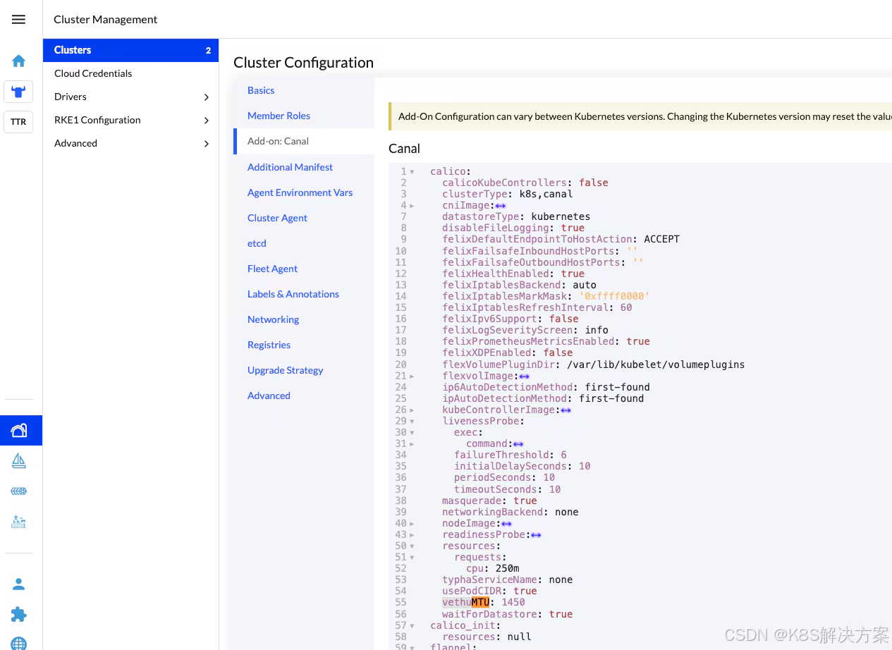 在集群管理 中找到目标集群。点击集群右侧的三点菜单,选择编辑配置 -> 集群配置 -> 附加组件:Canal。寻找 vethuMTU 字段,并根据需要更改值。
