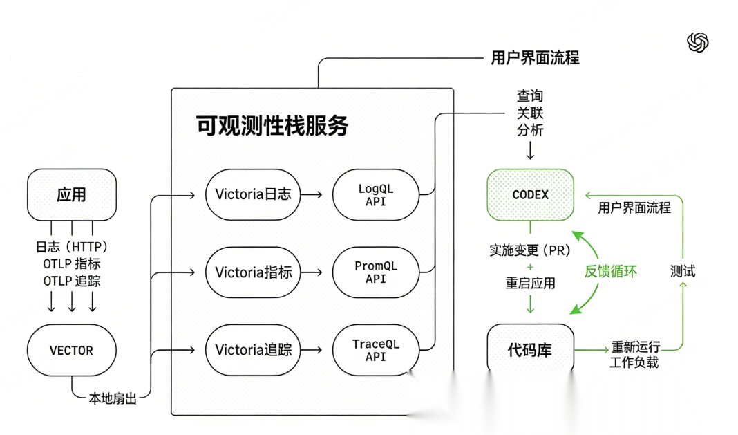 另一方面搭建了基于Victoria Logs、Victoria Metrics、Vector的本地临时可观测性栈,通过 OTLP 协议实现日志、指标、链路的采集,让 AI 能通过 LogQL、PromQL、TraceQL 自主查询数据,实现 “确保服务启动在 800ms 内” 这类精准的任务要求。