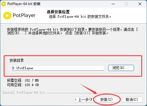6) 默认安装到 C 盘,这里强烈建议修改到其它盘(非系统盘),比如下图中将其安装到了 D 盘的 PotPlayer 文件夹里。确认安装路径后,点击“安装”