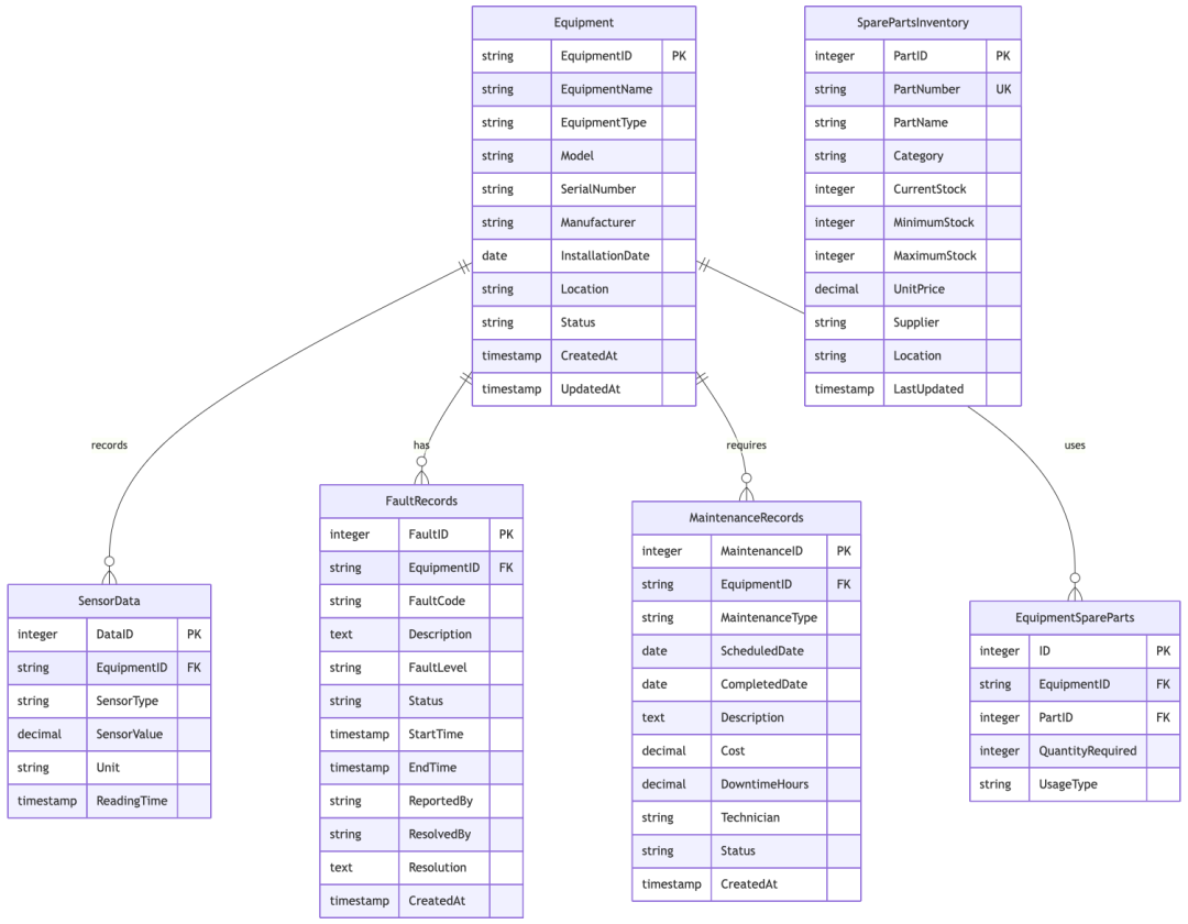 class Equipment(Base): """设备表模型""" __tablename__ = "Equipment" EquipmentID = Column(String(50), primary_key=True, default=lambda: f"EQ-{uuid.uuid4().hex[:8].upper()}") EquipmentName = Column(String(200), nullable=False) EquipmentType = Column(String(100), nullable=False) Model = Column(String(100)) SerialNumber = Column(String(100)) Manufacturer = Column(String(100)) InstallationDate = Column(Date) Location = Column(String(200)) Status = Column(String(50), default="Active") Description = Column(Text) CreatedAt = Column(DateTime, default=func.now()) UpdatedAt = Column(DateTime, default=func.now(), onupdate=func.now()) # 定义关系 - 一对多关系 sensor_data = relationship("SensorData", back_populates="equipment", cascade="all, delete-orphan") fault_records = relationship("FaultRecords", back_populates="equipment", cascade="all, delete-orphan") maintenance_records = relationship("MaintenanceRecords", back_populates="equipment", cascade="all, delete-orphan") equipment_spare_parts = relationship("EquipmentSpareParts", back_populates="equipment", cascade="all, delete-orphan")