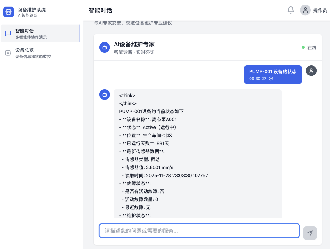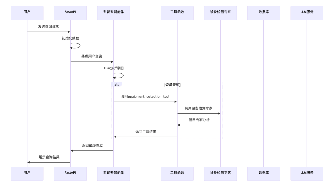 # 查询设备信息curl -X POST http://localhost:8000/query \ -H "Content-Type: application/json" \ -d '{"query":"列出全部设备信息"}'# 响应:{ "success": true, "thread_id": "a1b2c3d4-...", "response": "系统共有4台设备:\n1. 空压机A001 - 状态:运行中\n2. 冷却塔B002 - 状态:运行中\n3. 电机C003 - 状态:运行中\n4. 泵D004 - 状态:警告", "processing_time": 2.34, "agent_used": "multi_agent", "timestamp": "2025-11-30T21:00:00Z"}
