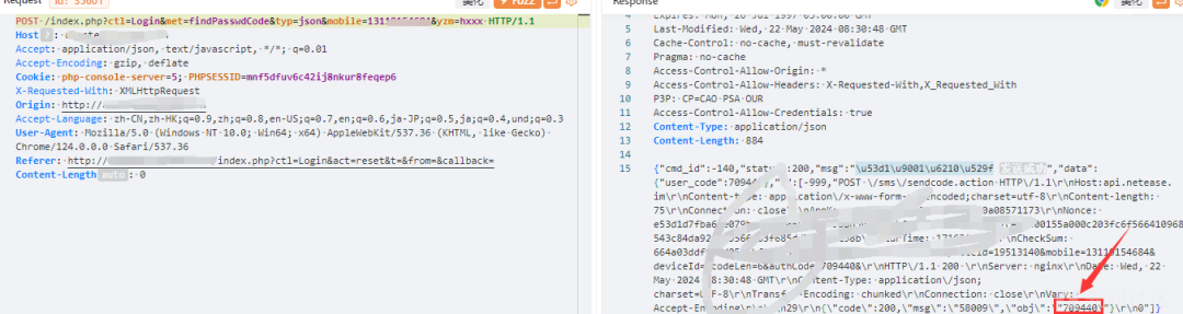 我正常注册了一位138账户进行模拟,省略过程,直接来到登录口进行测试,模拟攻击者不知道验证码的情况,随意输入然后拦截响应包