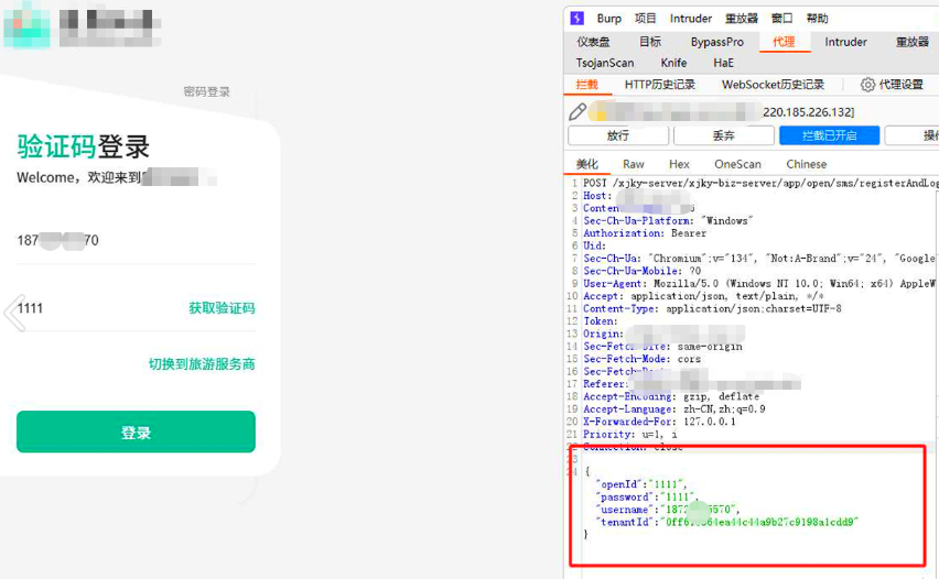 记录了注册手机号及短信验证码以及一串不知道的tenantId,正确的验证码会返回Token,后续请求带上Token对用户进行身份信息认证