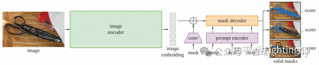 SAM由三部分组成,包括:图像编码器、提示编码器、轻量化的掩码解码器