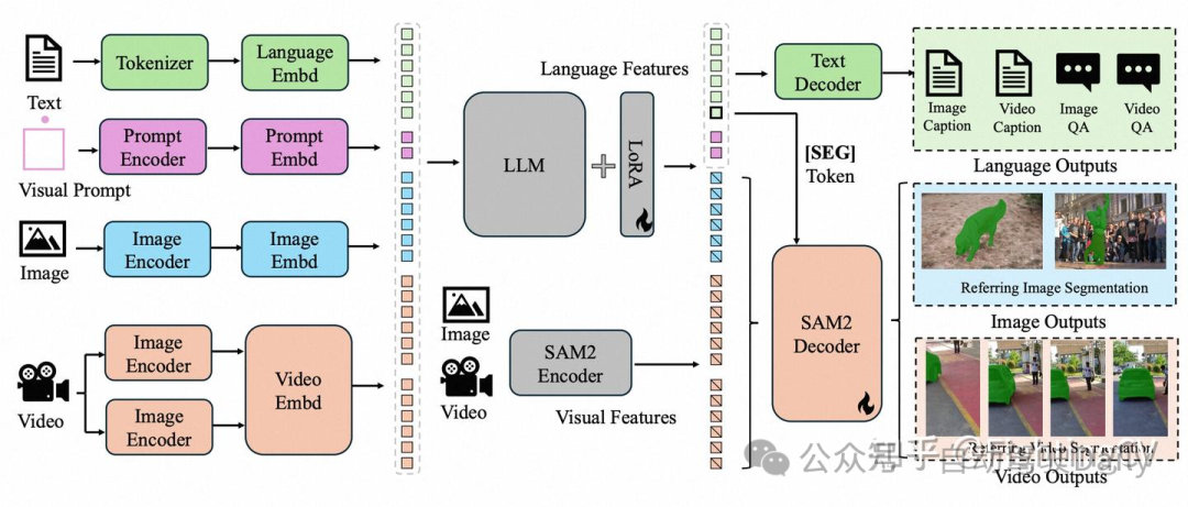 模型首先将输入文本、视觉提示、图像和视频编码为符元嵌入。 然后,这些符元通过一个大型语言模型(LLM)进行处理。 输出文本符元用于生成[SEG]符元和相关的语言输出。 SAM-2解码器接收来自SAM-2编码器的图像和视频特征,以及[SEG]符元,以生成相应的图像和视频掩码。