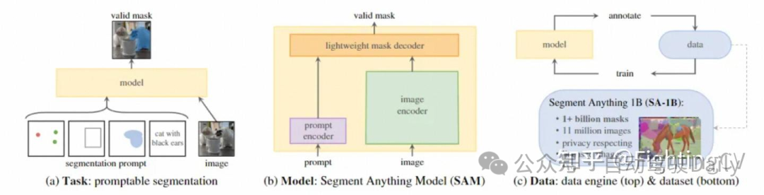 SAM借鉴了NLP领域的Prompt策略,通过给图像分割任务提供Prompt提示来完成任意目标的快速分割。Prompt类型可以是「前景/背景点集、粗略的框或遮罩、任意形式的文本或者任何指示图像中需要进行分割」的信息。如下图(a)所示,模型的输入是原始的图像和一些prompt,目标是输出"valid"的分割,所谓valid,就是当prompt的指向是模糊时,模型能够输出至少其中一个mask。