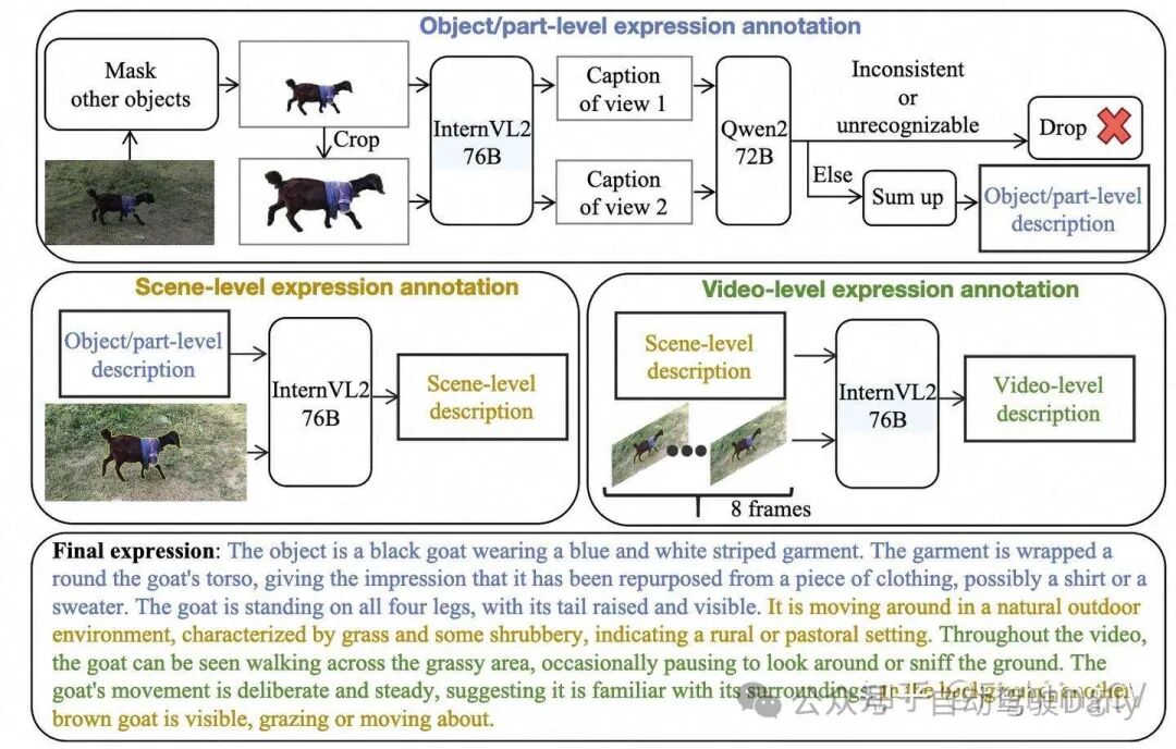 - Video-level annotation:“黄色轮廓用于突出显示图像中的对象(8帧)+上阶段的caption”输入到LLM生成video-level caption