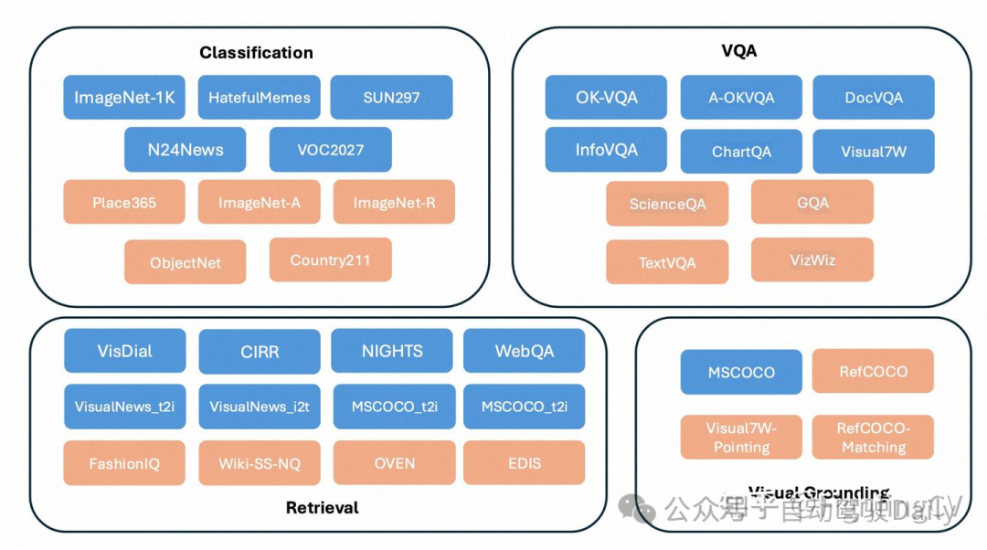 - 提出一种新的基准,MMEB (大规模多模态嵌入基准),其中包含 36 个数据集,涵盖四个元任务类别:分类、视觉问答、检索和视觉定位。(将这些任务都改为排序任务,计算Precision@1)