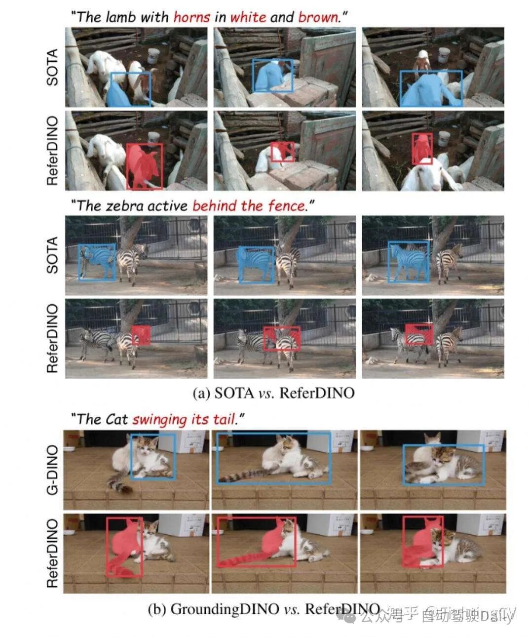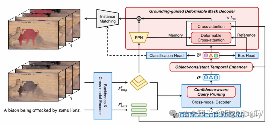 eferDINO的整体架构。 以蓝色着色的模块借自GroundingDINO,而以红色着色的模块是这项工作中新引入的。 基于逐帧目标特征{ t}t=1T,我们的目标一致性时序增强器利用跨模态文本特征实现帧间目标交互。 然后,我们的定位引导的可变形掩码解码器根据位置预测、跨模态文本特征和高分辨率特征图生成候选目标的掩码。 为了进一步提高视频处理效率,我们在跨模态解码器中引入了一种置信度感知查询剪枝策略。 最佳彩色视图。