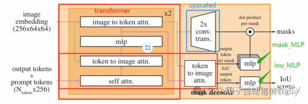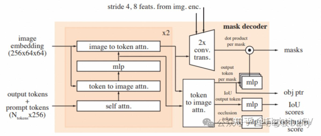 - Mask encoder:掩码解码器有效地将图像编码、提示编码和输出token映射到掩码。