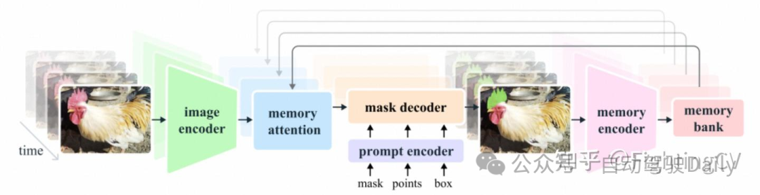 - Memory bank:通过维护最多N个最近帧的FIFO记忆队列来保留视频中目标对象的过去预测信息,并将提示信息存储在最多M个提示帧的FIFO队列中。