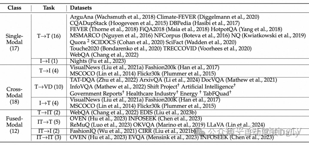 - 构建了一个通用多模态检索基准UMRB,包含47个数据集,涵盖单模态检索、跨模态检索、融合模态检索