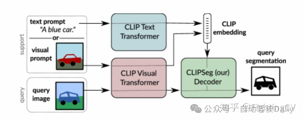 它能够根据任意文本查询或示例图像进行分割。为了实现这个系统,我们采用预训练的 CLIP 模型作为主干,并在其顶部训练一个薄条件分割层(解码器)。 我们使用 CLIP 的联合文本-视觉嵌入空间来调节我们的模型,这使我们能够处理文本形式和图像形式的提示。